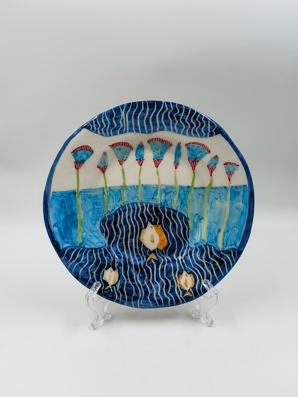 Πιάτο από λευκό πηλό μεγάλης αντοχής . Εξωτερικά είναι λευκό ενώ εσωτερικά έχουν σχεδιαστεί με το χέρι ψάρια, τα νερά του ποταμού Νείλου καθώς και λουλούδια λωτών. Έχουν ζωγραφιστεί στο χέρι και στη συνέχεια έχουν χαραχθεί με τη μέθοδο “sgraffito”. Η παράσταση είναι εμπνευσμένη από τα ταφικά μνημεία των αρχαίων Αιγυπτίων
